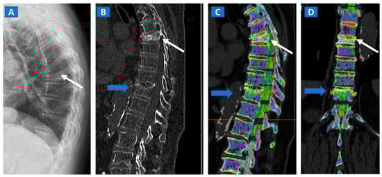 An 82-year-old female, unable to undergo MRI, with non-traumatic dorsal vertebral compression fractures. On the sagittal standard radiograph (A) a mid-dorsal spine fracture can be seen (white arrow). On the high resolution sagittal 1 mm reconstructed CT image (B), an additional fracture of the D9 vertebral body is suspected (blue arrow). On the corresponding sagittal (C) and coronal DECT superimposed map (D), D5 and D9 fresh vertebral fractures are confirmed by the presence of BME, coded in shades of green (arrows), while normal bone is coded in violet.