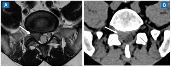 A 46-year-old male with non-traumatic, acute right sciatica pain. A large, right postero-lateral disk herniation (arrow) can be recognized at L5-S1 level both on the axial T2-weighted MR image (A) and on the corresponding axial 1 mm reconstructed CT image with a soft tissue window (B).