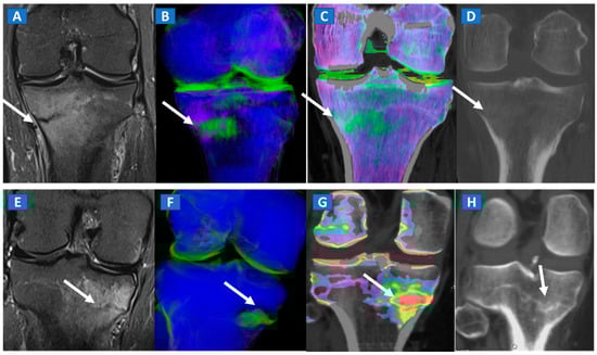A 42-year-old male long-distance runner with a bilateral tibial stress fracture. On the coronal STIR MRI images (A,E), a hypointense serpiginous subchondral line (arrows), surrounded by subtle BME involving the proximal tibia on the medial side, is depicted. On the DECT 3D maps (B,F) some BME is apparent around the fractures (arrows). On the corresponding DECT coronal 2D images (C,G), the presence of BME is confirmed (arrows), with a periphery to center gradient. The standard coronal reconstructed CT images (D,H) confirm the fracture lines (arrows). Note the absence of reactive sclerosis in the left knee (D) and the presence of sclerosis in the right one (H).