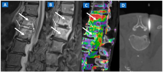 A 57-year-old male diagnosed with spondylodiscitis, and presenting with worsening low back pain. On the sagittal STIR MRI image (A), BME of the L1 and L2 vertebral bodies is apparent (thick arrows). The intervertebral disc appears hyperintense, with thickening of the anterior and posterior longitudinal ligaments (thin arrows). On the corresponding sagittal T1-weighted image (B) after intravenous administration of gadolinium, contrast enhancement is depicted, involving vertebral bodies (thick arrows) and thickened anterior and posterior longitudinal ligaments (thin arrows). On the DECT sagittal 1 mm reconstructed image (C), there is BME involving vertebral bodies (thick arrows) and the disc (thin arrow). Under CT guidance (D), sampling on para-spinal fluid collection was performed to confirm the diagnosis of spondylodiscitis and to isolate the pathogen involved.