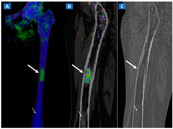 BME represents a common imaging change that is detectable in several inflammatory disorders of the skeletal system, such as autoimmune or septic arthritis. While BME can be used to evaluate the response to therapy in the short term, bone erosions and morphological changes can be used to evaluate the course of disease in the long term (Figure 8 and Figure 9). In cases of advanced inflammatory arthritis, the presence of osteopenia makes it easier for DECT to identify BME, while high resolution CT images can finely identify bone erosions, articular space narrowing and bone remodeling (Figure 8). In painful gout, in addition to identifying tophi, DECT can also assess bone remodeling and detect associated BME [14] (Figure 9). Furthermore, DECT can accurately evaluate BME in patients with sacroiliitis associated with axial spondylarthritis [13].