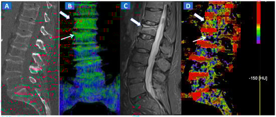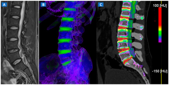 Generally, magnetic resonance imaging (MRI) is the preferred method for diagnosing BME [9,10]. However, MRI cannot be routinely used for all patients, owing to contraindications and its limited availability, especially in acute or traumatic settings. Computed tomography (CT) is the most frequently used imaging tool for body and skeletal trauma, and dual-energy computed tomography (DECT), in particular, has previously successfully identified BME in the spine [11] and in the lower and upper limbs [12,13].