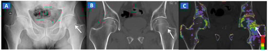 - Foti, G.; Faccioli, N.; Silva, R.; Oliboni, E.; Zorzi, C.; Carbognin, G. Bone marrow edema around the hip in non-traumatic pain: Dual-energy CT vs. MRI. Eur. Radiol. 2020, 30, 4098–4106. [Google Scholar] [CrossRef] [PubMed]