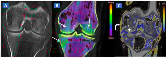 A 65-year-old female with a post-traumatic medial menisci rupture and diffuse BME. On the standard 1 mm reconstructed coronal CT image (A), there are no signs of fracture. On the corresponding 2D 1 mm reconstructed 2D DECT image (B), the BME appears more pronounced on the femoral condyles and on the medial tibial plateau (arrows). By using different color-coding (C), it was possible to identify a rupture of the medial menisci (straight arrow), with thickening and oedema of the medial collateral ligaments (curved arrow).