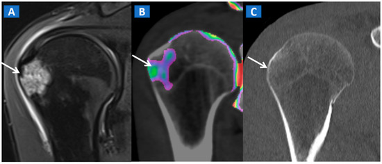 A 35-year-old male with traumatic BME of the humeral head. On the coronal STIR MRI image (A), post-traumatic BME of the humeral head is depicted as a hyperintense signal in the subcortical area (arrow). The presence of BME is confirmed on the 2D DECT coronal 1 mm reconstructed image (B) (arrow). The high resolution 1 mm coronal CT image with bone window (C), rules out the presence of cortical fractures.
