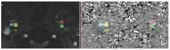 The 2D magnitude (a) and phase contrast (b) slice above the carotid bifurcation showing the cross-sectional areas in the regions of interest. R1: left external carotid artery. R2: left internal carotid artery. R3: right external carotid artery. R4: right internal carotid artery.
