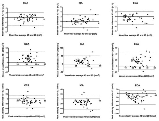 Cross-sectional area values between methods showed no significant correlations for CCA (r = 0.18, p = 0.269), ICA (r = 0.1, p = 0.543), and ECA (r = 0.05, p = 0.767). The 4D-flow overestimated the vessel area in CCA (36.9 mm2 vs. 52.5 mm2, p < 0.001), in ICA (23.4 mm2 vs. 39.4 mm2, p < 0.001), and in ECA (20.0 mm2 vs. 35.9 mm2, p < 0.001).