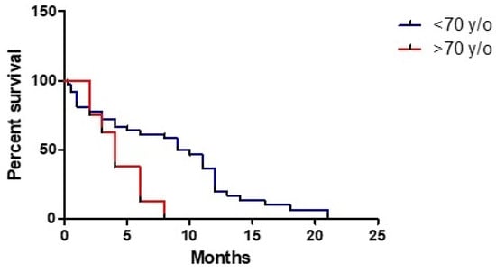 Analysis of correlation between age and OS revealed a 4% higher relative risk for every year (HR 1.039, 95% CI: 1.010–1.069, p < 0.009) with a worse prognosis among patients with an age ≥70 years (HR 3.064, 95% CI: 1.271–7.385, p < 0.013) (Figure 1). On the contrary, sex was not shown as a prognosis factor (HR 0.819, 95% CI: 0.4204–1.595, p = 0.557) as well as preoperative KPS (HR 1.009, 95% CI: 0.987–1.031, p = 0.418).
