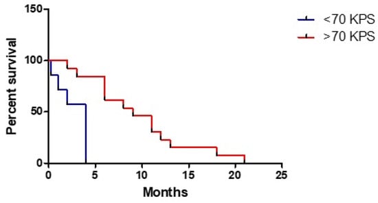 Postoperative KPS was shown to have a good significative correlation with OS, in particular if it has a ≥ 70 value (HR 0.111, 95% CI: 0.023–0.536, p < 0.01) (Figure 2); considering a deeper analysis, for every KPS 10 points improvement a gain of 1.35 months emerged (HR 0.135, 95% CI: 0.938–0.994, p < 0.02).