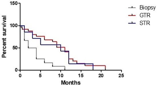 A GTR (HR 0.258, 95% CI: 0.117–0.571, p < 0.001) and a STR (HR 0.308, 95% CI: 0.112–0.842, p < 0.022) appeared to have a strong role in determining a better prognosis if they were compared to the biopsy (Figure 3).