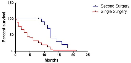 Different effect of a single or a second surgery on overall survival.