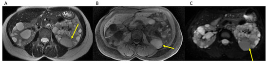 Hemorrhagic cyst (yellow arrow) remains brighter than background on b0 images (A). Axial T2WI through kidneys and cysts. (B). Axial T1 without contrast through kidneys and cysts. (C). Axial b0 through kidneys and cysts.