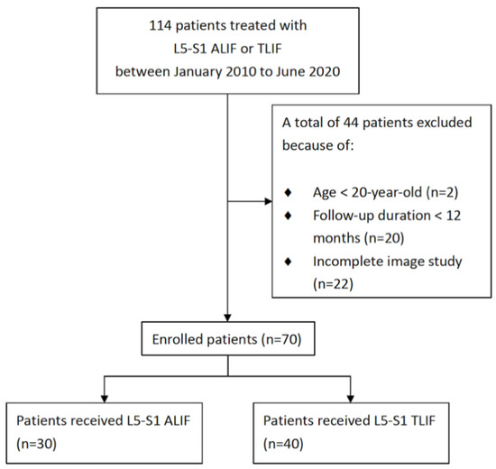 This retrospective study reviewed the medical records and radiographic images of 70 patients who received interbody lumbar fusion. Refractory and disabling back pain with degenerative discs, spondylolisthesis, spinal stenosis, or scoliosis are indications of spinal fusion [20]. The interbody fusion technique was decided by the patients after the surgeon explained the advantages and disadvantages of ALIF and TLIF treatments. The diagnosis of the patients in this study included spondylolisthesis, herniated intervertebral disc, and spinal stenosis at the L5-S1 level. All patients underwent the operation at a single medical center between 2011 and 2020, and Figure 1 displays the inclusion flow chart. The inclusion criteria were as follows: (1) being aged ˃20 years, (2) receiving single-level ALIF or TLIF treatment at L5–S1, and (3) having a follow-up duration ˃ 12 months. The exclusion criteria were as follows: (1) receiving revision surgery after lumbar fusion, (2) receiving lumbar operation at any level of the lumbar spine other than L5–S1, (3) having a diagnosis of nonunion after lumbar fusion at L5–S1, and (4) having a spinal deformity related to malignancy, trauma, or infection. This study was approved by the Institutional Review Board of Taichung Veterans General Hospital (No CE21228A).