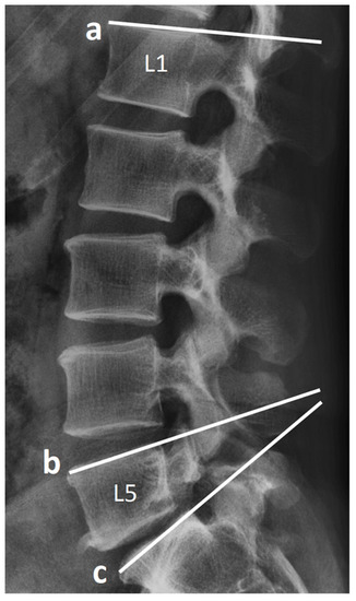 Lines a, b, and c parallel the superior endplates of L1, L5, and S1, respectively. The included angle between line a and line c indicates the measurement of lumbar lordosis. The included angle between line b and line c indicates the measurement of segmental lordosis.