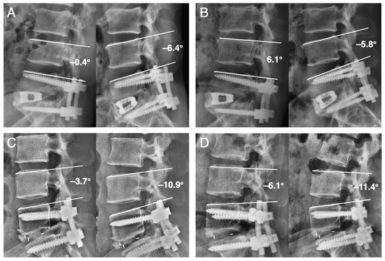 Dynamic lateral radiographs exhibit examples of development/non-development of instability (angular motion > 10°) at L4-L5 in patients who received ALIF or TLIF treatment. Images were obtained from a 48-year-old man who received L5–S1 ALIF (A,B) and a 41-year-old woman who received L5–S1 TLIF (C,D). (A) Postoperative radiographs exhibiting normal angular motion at L4–L5 (6°). (B) 12-month follow-up radiographs showing 11.9° angular motion at L4–L5 with definitive evidence of instability. (C) Postoperative radiographs showing normal angular motion at L4–L5 (7.2°). (D) 12-month follow-up radiographs exhibiting 5.3° angular motion at L4–L5 without definitive evidence of instability.