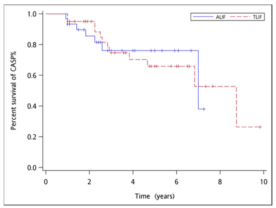 Survival analysis of CASP incidence revealed no significant difference between the two groups (Table 4). The 5-year disease-free survival rate was 68% in the ALIF group and 35% in the TLIF group (p = 0.57). Figure 5 is the Kaplan–Meier survival curve of ALIF versus TLIF treatment. Only one patient in the ALIF group received oblique lumbar interbody fusion as revision surgery at L3-5 level due to the development of CASP seven years after the previous lumbosacral fusion.