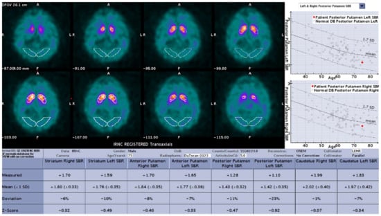 Semi-quantitative software has been developed to assist in the interpretation of DaT-SPECT imaging using reproducible, standardized methods [,,]. Semi-quantitative software can be optimized to be comparable to visual reads by experienced readers, potentially allowing inexperienced readers to increase their accuracy in everyday practice, as well as improving the confidence of experienced and inexperienced reader interpretations [,,,]. DaTQUANTTM (GE Healthcare, Chicago, IL, USA) is an FDA-approved, semi-quantitative software that enables the visual evaluation and quantification of DaTSCANTM images relative to normal population databases of I-123-ioflupane uptake.