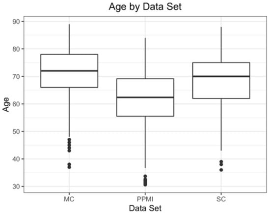 The mean age of the participants overall was 66 years old, with 40% female participants. The mean age for each individual group ranged from 62 (PPMI) to 71 (MC) years old, with 33% (PPMI) to 48% (SC) female participants (Table 1). A majority of participants were in their sixth to eighth decades of life, with the youngest participant being 36 years old and the oldest being 88 years old (Figure 2).