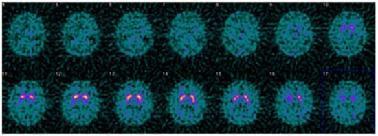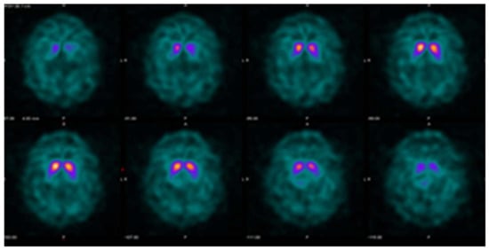 Parkinson’s disease and related neurodegenerative disorders, such as multiple system atrophy and dementia with Lewy Bodies (DLB), demonstrate pathologic loss of nigrostriatal dopaminergic neurons. In conjunction with history and clinical examination, evaluation of nigrostriatal dopamine transporters (DaT) in Parkinsonian Syndromes (PS) can be performed with DaTSCANTM (Ioflupane iodine-123 [I123]) using single photon emission computed tomography (SPECT). DaT-SPECT imaging evaluates the dopaminergic neuronal pathway via radiotracer uptake by presynaptic dopamine transporters in the striatum [,,,,,]. This allows for the differentiation between nigrostriatal degenerative disease (NSDD) and other non-NSDD entities, such as essential tremor, vascular Parkinson’s, drug-induced Parkinson’s, and Alzheimer’s disease, which do not involve degeneration of dopaminergic neurons, but may present with similar clinical features.