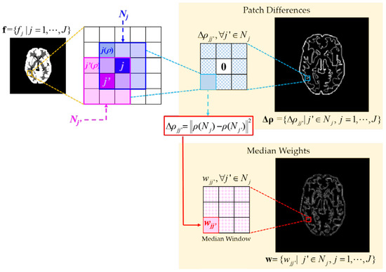 Figure 1 illustrates self-similarity driven median weights whose values for the pixel j are determined by the patch differences , which are measured by calculating the difference between the center patch and its neighbor patch for all . The median weights are calculated in such a way that the higher the relative similarity between the center patch and its neighbor patch is, the more probable the median of the neighbor patch (designated as ) is to be chosen as the median of the center patch within a median window. If the difference between the center patch and its neighbor patch is negligible, the value of is close to 1, which is the largest possible value of in the median window. In this case, a relatively larger weight is assigned to , so that becomes more probable to be chosen as the median of . In contrast, when the neighbor patch is dissimilar to the center patch, the value of is close to 0. In this case, a relatively smaller weight is assigned to , so that becomes less probable to be chosen as the median of . This implies that, for the homogeneous regions consisting of nearly uniform patches, the SDMR behaves similar to the NWMR by using almost-uniform weights. On the other hand, for the non-homogeneous regions consisting of different patches, the SDMR preserves fine-scale edges more accurately than the NWMR by using the nonuniform weights whose values are close to one only when the similarities are very high.