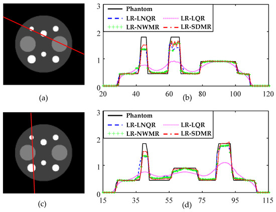 Profile plots for LR anecdotal reconstructions: (a) LR phantom with a profile line shown; (b) profile plots along the line shown in (a) for LR reconstruction methods (LNQR, LQR, NWMR and SDMR); (c) LR phantom with a profile line shown; (d) profile plots along the line shown in (c) for LR reconstruction methods (LNQR, LQR, NWMR and SDMR).