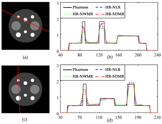 Profile plots for HR anecdotal reconstructions: (a) HR phantom with a profile line shown; (b) profile plots along the line shown in (a) for HR reconstruction methods (NLR, NWMR and SDMR); (c) HR phantom with a profile line shown; (d) profile plots along the line shown in (c) for HR reconstruction methods (NLR, NWMR and SDMR).