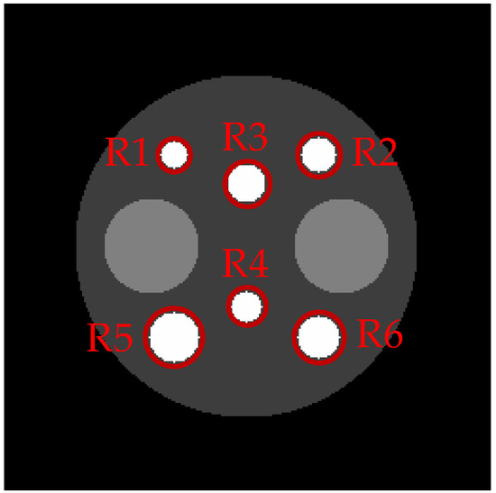 To evaluate the regional performance of each algorithm, we first selected the six high-intensity circles (as shown in Figure 5) as regions of interest (ROIs) and computed the mean contrast recovery coefficients (MCRCs) of the reconstructions calculated from 50 independent noise trials. The regional MCRC defined in (20) measures how well the algorithm restores the contrast of an ROI with respect to its background chosen from the base circle with a low intensity.