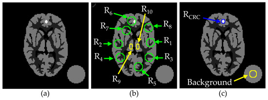 Hoffman brain phantom and ROIs for regional MPE and MCRC measures: (a) phantom; (b) ROIs for regional MPE; (c) ROI for CRC with respect to background.