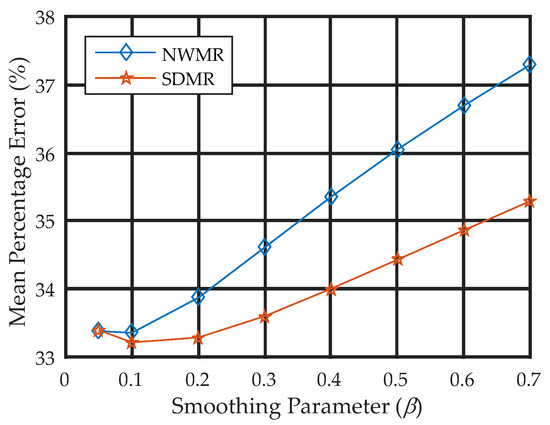 According to our additional test for a wide range of smoothing parameter settings, the SDMR was less sensitive to variations in the smoothing parameter than the NWMR. Moreover, for the same value of the smoothing parameter, the SDMR always outperformed the NWMR in terms of the MPE and MCRC. As the smoothing parameter increased, the difference in the MPEs, as well as that in the MCRCs, between the SDMR and NWMR became more significant.