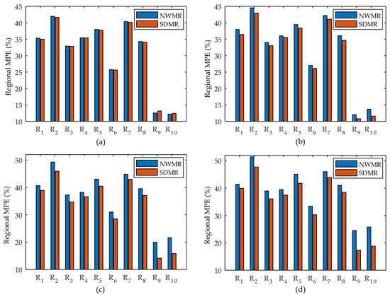 Error-bar plots for regional MPE for NWMR and SDMR: (a) β = 0.05; (b) β = 0.2; (c) β = 0.5; (d) β = 0.7.
