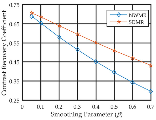 Figure 10 shows the regional MCRC curves over the range of calculated in the ROI with respect to the background designated in Figure 6c, where each regional MCRC was calculated from 50 independent noise trials. It is clear that the SDMR outperformed the NWMR over a wide range of the smoothing parameter. Moreover, the difference in the MCRC between the SDMR and NWMR became more significant as the smoothing parameter increased.