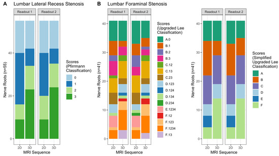 Stacked barplots for the visualization of grading scores stratified by readout and sequence. (A) shows the scores for the grading of lumbar lateral recess stenosis and (B) shows the grading of lumbar foraminal stenosis. Note the shift toward higher grade stenosis on 3D imaging.