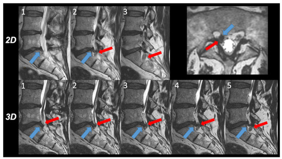 Intra-individual comparison of the 2D and 3D images. The relationship between disc herniation (blue arrow) and nerve root (red arrow) within the lateral recess right side was evaluated on three consecutive 2D T2w TSE images (upper row 1 to 3) and on five 3D T2w TSE images (lower row 1 to 5) depicting each second image. On 2D T2w TSE images, a contact between the disc herniation and the nerve root is depicted in image 2, graded as 1 according to the Pfirrmann grading system. However, in 3D T2w TSE images, a deviation and compression of the nerve root, corresponding to grade 3, was obvious in images 2, 3, and 4 and verified in the transverse thin slice reformatted image.