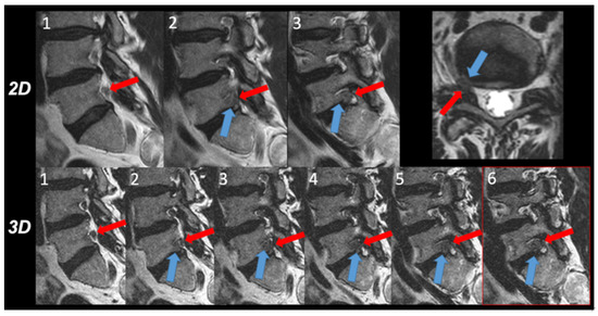 Intra-individual comparison of the 2D and 3D images. The relationship between disc herniation (blue arrow) and nerve root (red arrow) within the intervertebral foramen right side was evaluated in three consecutive 2D T2w TSE images (upper row 1 to 3) and in six 3D T2w TSE images (lower row 1 to 5) depicting each third to fourth image. In 2D T2w TSE images, contact between the disc herniation and the nerve root is depicted in images 2 and 3, however, no nerve root compression was appreciated. In 3D T2w TSE images, however, a compression of the nerve root due to the intraforaminal disc herniation was obvious in images 3 to 6 and verified in the transverse thin slice reformatted image.