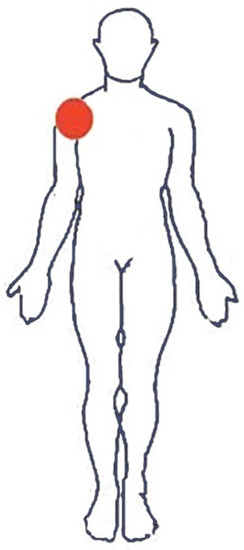 A 56-year-old WB player and employee self-referred to our outpatient physical therapy clinic complaining of right SP. He had been playing WB for 15 years at a professional level (i.e., Italian B-league WB championship). The patient suffered from poliomyelitis since early childhood, which forced him into a wheelchair. He reported that SP gradually started in the last 2 months, without any trauma or training changes. In the beginning, he continued to work and play WB regularly because SP was bearable. However, after 1 month, it worsened while performing a high-resistance overhead pull-down exercise during a WB training session. The patient referred to an acute pain on his anterior right shoulder, rated as a 5/10 on the numeric pain rating scale (NPRS) [37] (Figure 1). During the following 2 weeks, SP increased to a 6/10 NPRS due to WB, walking with crutches, and performing daily living activities requiring flexion or abduction of the shoulder above 50° or cross-body adduction movements. Thus, the pain became constant and deep. In addition, there were no soothing movements or positions. Interestingly, over time, pain further worsened during the night (7/10 NPRS), especially in a supine position, forcing the patient to take NSAIDs (i.e., ibuprofen, 400 mg) every night to improve his sleep, with a partial decrease in symptoms. Lately, he also noticed a new superficial pain associated with tingling on the backside of his shoulder, which radiated to the medial part of his arm (3/10 NPRS) (Figure 2). In his past medical history, the patient reported two previous surgeries because of a right Achilles tendon tear and denied any systemic symptoms such as fever, unexplained recent weight loss or gain, and any bowel or bladder symptoms. Notably, the patient is a blood donor with a frequency of four times a year, and his last blood tests were unremarkable. Moreover, in the last 2 months, no infections or travel abroad were reported. Because of these symptoms, he was forced to use the wheelchair instead of crutches and decided to contact his general practitioner (GP). The GP, after a brief evaluation based mainly on the anamnesis, made a diagnosis of subacromial impingement syndrome (SIS), prescribed him pain killer drugs (i.e., Tramadol), and referred him to a physiotherapy service for 10 sessions of laser therapy and exercises. For this reason, the patient decided to seek his PT for further evaluation.