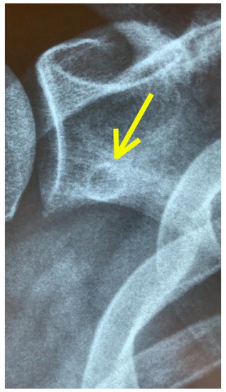 Figure 3. X-ray imaging. A small radiolucent formation is present on the lower portion of the scapular neck with hyperdense margins and an intact cortical rim of non-univocal interpretation (yellow arrow).