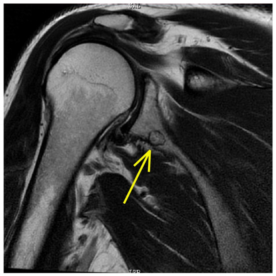 The plain radiographs (Figure 3) showed a “small radiolucent formation at the lower portion of the scapular neck with hyperdense margins, and an intact cortical rim of uncertain interpretation”, while the MRI clearly described the presence of a “roundish centimetric formation with surrounding osteosclerotic border in the lower portion of the scapular neck. This lesion showed a central component with intermediate signal intensity (nidus) and is compatible in the first instance with OO with atypical localization” (Figure 4). Moreover, MRI reported a tendinosis of the subscapularis muscle, minimal tenosynovitis of the long head of the biceps tendon, and fibroadipose degeneration of the teres minor muscle.