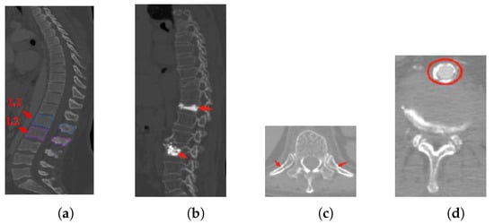 - Interference information: there are several soft tissues whose gray-scale is similar to the vertebrae area (as shown in Figure 1c,d).
