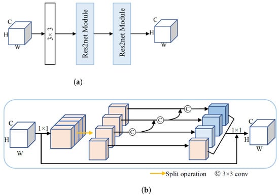 We design a new multi-scale convolution whose structure is shown in Figure 4a. The cascading of one 3 × 3 convolution and two modules can further expand the receptive field of the network. Meanwhile, the [] module was used to extract multi-scale features to obtain the local and global information. Figure 4b shows the structure of the module. After a convolution, the input feature map is split into S feature map subsets, denoted by , . The feature subset is added with the output and then fed into layer. In order to reduce parameters, is obtained from by identity mapping. The output of the module, the Y, can be represented by Equation (5):