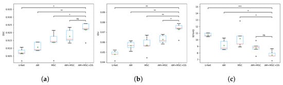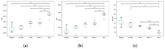 The box plots of metrics of ablation study. (a) DSC coefficient comparison; (b) IOU coefficient comparison; (c) 95% HD coefficient comparison. * indicates a significant difference between the corresponding experiments, with *** p ≤ 0.001, ** p ≤ 0.01, * p ≤ 0.05, and ns p ≤ 1 (paired t-test).