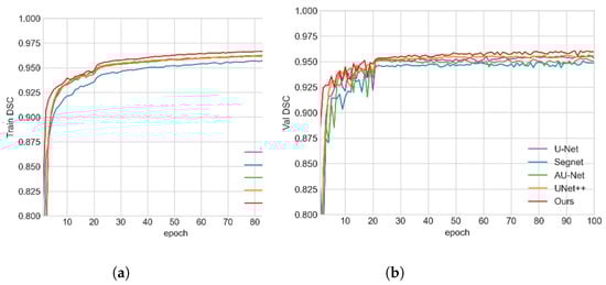 As shown in Figure 7, in the training process, our value is higher than the other algorithms. The training results are in good agreement with the test results. In the validation process, the fluctuation of our model is lowest, proving that our model has a better segmentation stability.