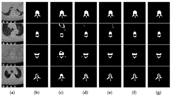 Visual comparison. (a) Original image. (b) Ground truth. (c) SegNet. (d) AU-Net. (e) U-Net. (f) U-Net++. (g) Verte-Box.