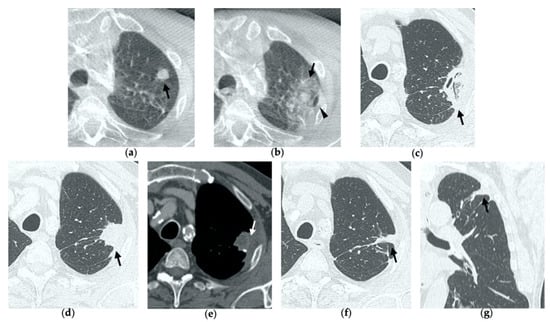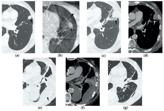 BPF is defined as communication between a bronchus and the pleural space through the ablation zone (Figure 6e,f). The management of this complication is challenging, since treatment may require insertion of a percutaneous drainage or eventually surgery, bronchoscopic or interventional procedures. As a result, BPF represents an extremely rare though potentially severe complication and it should be suspected in cases of delayed or persistent pneumothorax, detected with chest X-ray, respectively, during early and late follow-up CTs (Figure 7) [26].