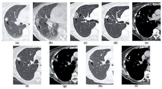 After 6 months, the ablation site undergoes further involution and there should not be any inner contrast enhancement, except for the persistent benign periablational area (Figure 2f,g) [7]. The previously mentioned cavities decrease in size and may completely disappear. CT images may show fibrotic scarring without contrast enhancement and mild architectural parenchymal distortion of the surrounding lung (Figure 1f,g) [24]. At this stage, small treated nodules may already show a linear fibrotic evolution on CT images (Figure 2h,i).
