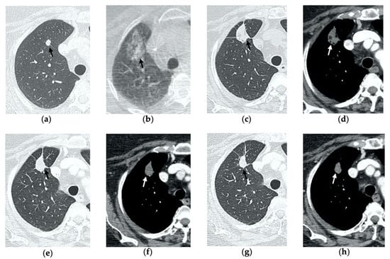 63-year-old woman with pulmonary metastasis from colorectal cancer (CRC) in the right upper lobe. (a) Axial CT of the metastasis (black arrow) prior to treatment. (b) Cone-beam CT image obtained post-procedure shows hazy GGO (black arrow) of the ablation site surrounding the treated nodule. (c,d) Axial 2-month follow-up CT images show a large consolidation with hypoattenuating bubbles (black arrow) and no contrast uptake (white arrow). (e,f) Axial 5-month follow-up CT images demonstrate a decrease in the size of the consolidation (black arrow) with no central contrast enhancement (white arrow). (g,h) Axial CT images obtained after 8 months show minimal further decrease in size with no signs of residual disease.