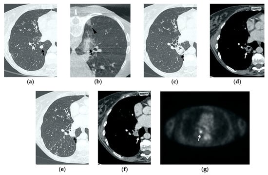 77-year-old-woman with pulmonary metastasis from CRC in the right lower lobe. (a) Axial CT images prior to treatment (black arrow). (b) Prone cone-beam CT image post-MWA shows GGO of the ablation site (black arrow) and alveolar hemorrhage along the needle tract (arrowhead). (c,d) Axial 1-month follow-up CT shows a subpleural consolidation with well-defined margins, inner hypoattenuating bubbles, a central cavitation (black arrow) and no contrast enhancement (white arrow). (e,f) Axial 6-month follow-up CT images demonstrate resolution of the cavitation, decrease in size of the consolidation (black arrow) and focal uptake of contrast material (white arrow) consistent with a diagnosis of residual disease. (g) The diagnosis is confirmed by PET/CT performed at 7 months (white arrow).