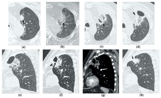 68-year-old man with a biopsy-proved squamocellular carcinoma in the left upper lobe. (a) Axial CT before treatment. (b) Cone-beam CT image at the end of MWA shows a wide GGO area (black arrow) among the ablation site. (c–e) Since persistent hydro-pneumothorax on chest X-rays is detected, CT without contrast administration is performed before the usual 1-month follow-up; axial and sagittal CT images show a large consolidation with central cavitation (black arrow); on a different level, a concomitant hydro-pneumothorax is evident (arrowhead); the diagnosis of broncho-pleural fistula is made. (f,g) Sagittal 2-month follow-up CT images show a decrease in size of the cavitated consolidation and hydropneumothorax; a communication between a bronchus and the pleural cavity is evident (black arrow); (f) the consolidation shows no contrast enhancement (white arrow). (h) Axial 4-month follow-up CT image shows a decrease in size of the consolidation with complete resolution of both cavitation and pneumothorax (black arrow).