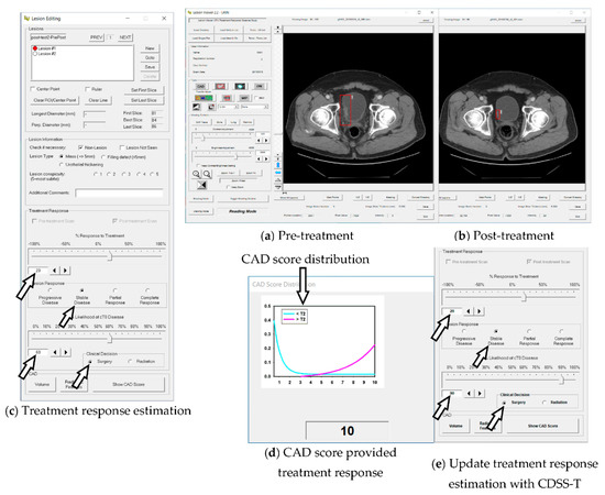 Seventeen physicians from six specialties and four institutions, University of Michigan (UM), Pennsylvania State University (PSU), University of Iowa (UI), and Tokuda Hospital (TH), Sofia, provided assessment of response by reading the pair of pre- and post-treatment CTU for each cancer. The specialty and institution information of observers is presented in Table 2. A graphical user interface developed for CDSS-T was used to assist physicians to make the estimations. First, without CDSS-T (Figure 1a,b), the pre- and post-treatment scans were shown side-by-side. The physician provided the estimation of treatment response (Figure 1c), consisting of: (1) percentage response to treatment on a scale of −100% to +100% using the Response Evaluation Criteria in Solid Tumors (RECIST) criteria [14], where 0% indicated no change between the pre- and post-treatment scan, −100% indicated at least doubling of tumor size, and 100% indicated a complete response; (2) tumor response category (based on the RECIST criteria) including progressive disease, stable disease, partial response, and complete response [14]; (3) likelihood of T0 stage (complete response) on a scale of 0 to 100%, where 0 indicated no chance of this post-treatment cancer being at T0 stage and 100% indicated 100% chance of this post-treatment cancer being at T0 stage; (4) a recommendation for the next treatment procedure including surgery or radiation. Second, with CDSS-T (Figure 1d), a CAD score along with the CAD score distributions was shown to the physician. The physician might revise his/her estimates or leave them unchanged (Figure 1e). For the analysis of intra-observer variability, a subset (mean N = 51) of the 157 lesion pairs was assessed for the second time by the 17 observers. Note that this subset or 51 lesions was randomly sampled so that it varied for each observer. The first read of the subset was called the original evaluation, and the second read of the subset was the repeated evaluation in the following discussion.
