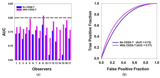 Results of the observer performance study. (a) AUCs of the 17 observers with and without CDSS-T. The performance of the CDSS-T system is shown with the dashed line. The performance of all but one observer (#6) increased with using CDSS-T. (b) Average ROC curves with and without CDSS-T.