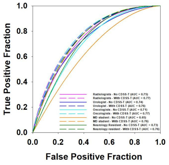 The average AUC values and the corresponding ROC curves for the physicians from the different specialties are shown in Table 6 and Figure 3, respectively. Radiologists, oncologists, and the medical student had statistically significant improvement after using CDSS-T (p < 0.020). The improvement gained by the urologist and the neurology fellow did not reach statistical significance (p = 0.244 and p = 0.083, respectively). Note that the number of observers in each group was different so that the level of significance should not be directly compared. There was a difference between the average AUCs of observers from different specialties without CDSS-T. However, with CDSS-T the performance was improved to a similar level.